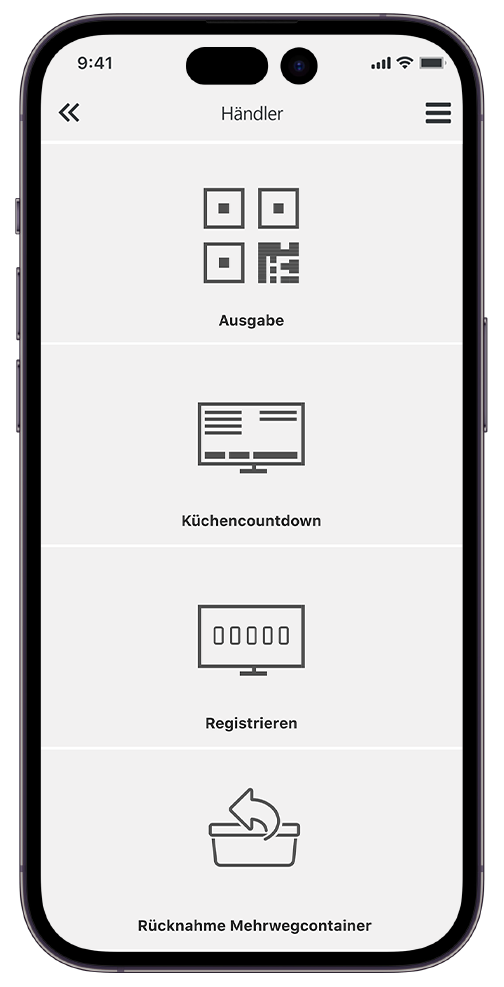 Das Modul erlaubt die Integration von Mehrwegverpackungen in die Mittagstisch-App (Speiseplan / Sortiment für das Order-Modul). Ausgabe, Hinterlegung, Rücknahme und Verbuchung der Geschirrteile können direkt mit dem Systemanbieter verknüpft werden. Dadurch ist das Modul auch eigenständig nutzbar.