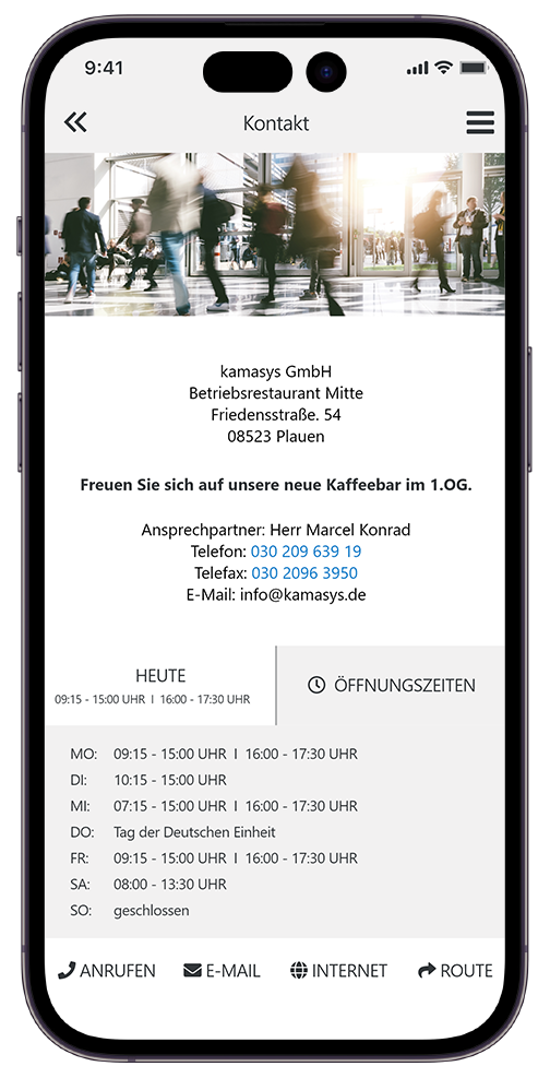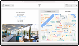 Darstellung der verschiedenen Ansprechpartner und Kontaktdaten pro Standort und Outlet mit den jeweiligen Öffnungszeiten, einer Routenfunktion sowie der Möglichkeit direkt via E-Mail oder Telefon Kontakt aufzunehmen.