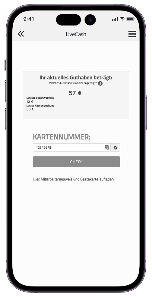 Einbindung des Links zur Guthabenprüfung der virtuellen oder physischen Chipkarte.